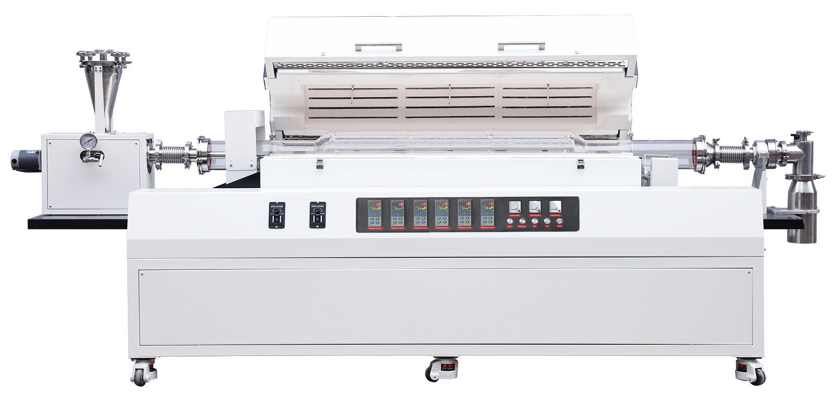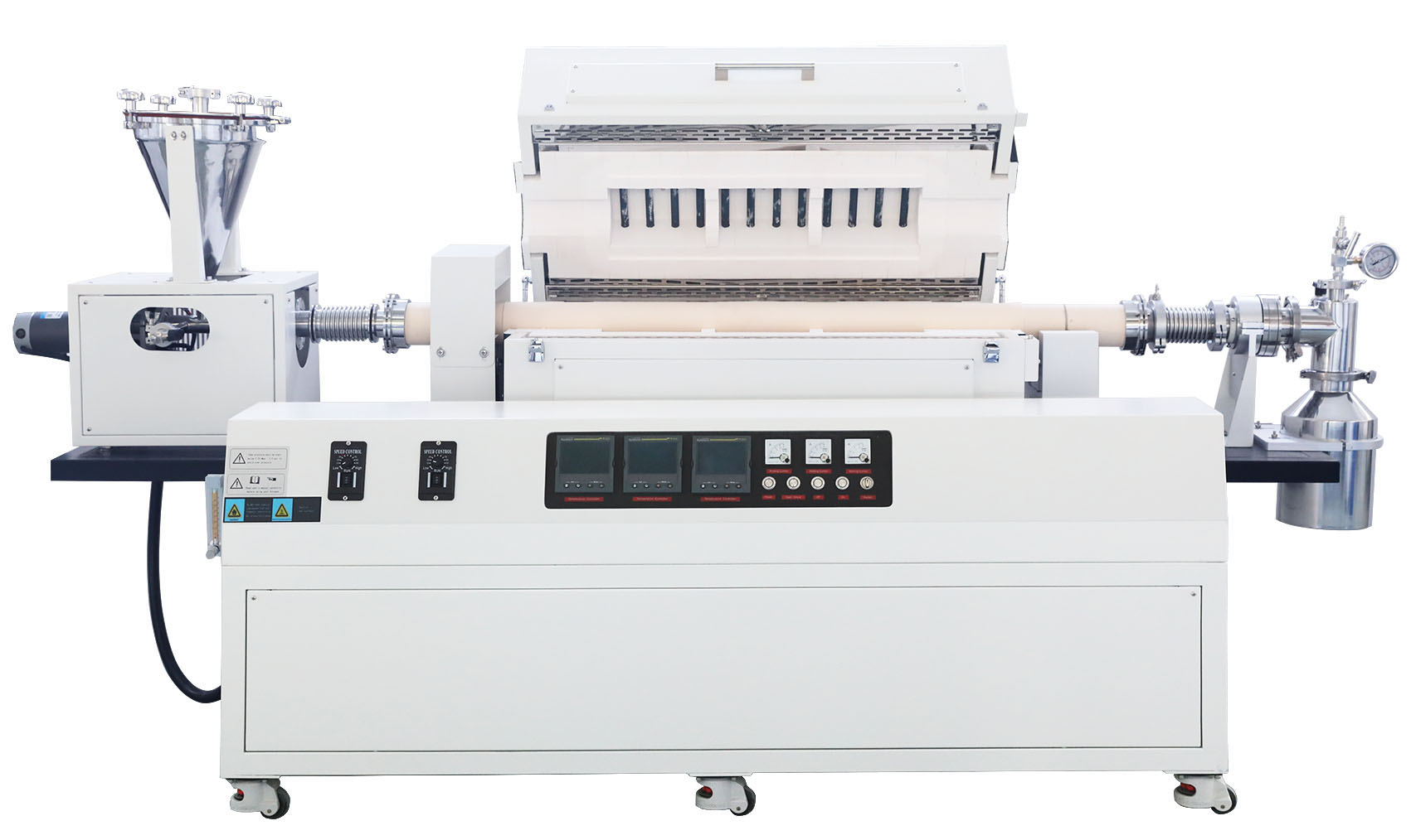 真空連續(xù)進(jìn)料回轉(zhuǎn)管式爐由加熱系統(tǒng)、自動回轉(zhuǎn)機(jī)構(gòu)、自動進(jìn)出料套件、真空密封系統(tǒng)和爐體傾斜機(jī)構(gòu)組成,爐管可360°旋轉(zhuǎn),轉(zhuǎn)速可調(diào);爐管前端配置自動旋轉(zhuǎn)加料裝置,加料裝置可根據(jù)產(chǎn)量選配和加料速度的在線調(diào)節(jié),爐體可傾斜15°,爐管末端配置有物料收集裝置,可在真空和氣氛下工作,可實現(xiàn)產(chǎn)品研發(fā)或產(chǎn)品中試等連續(xù)化小批量生產(chǎn),該產(chǎn)品主要應(yīng)用于無機(jī)非金屬化合物材料、鋰電正負(fù)極材料、陶瓷材料、新能源和新材料行業(yè)的顆粒粉末燒結(jié)熱處理專用設(shè)備;
